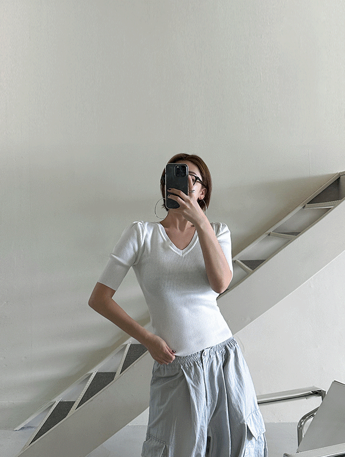 넛티 브이넥 골지 퍼프 니트 (5col)