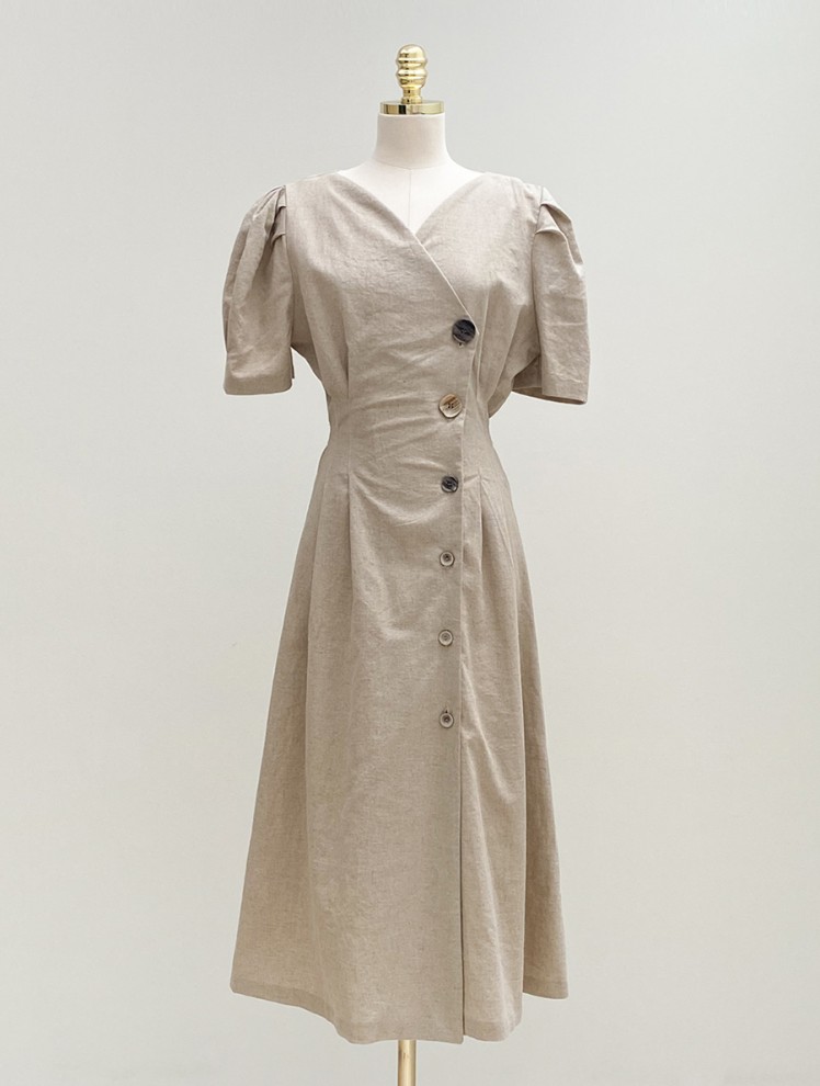 투론드 버튼포인트 소매퍼프 핀턱원피스 (2col)