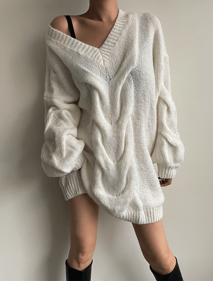 테본 꽈배기 브이넥 오버핏 니트 (3col)